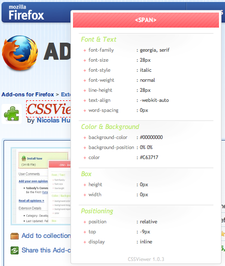 CSS Viewer reprend l’une des caractéristiques de la barre d’outils du plugin Web Developer, en l’améliorant en le rendant ainsi plus facile d’utilisation. Il suffit de pointer votre curseur sur n’importe quel élément de la page et CSS Viewer va vous montrer tous ses attributs CSS, de la taille de la police à sa position en passant par les couleurs, le tout dans un popup.