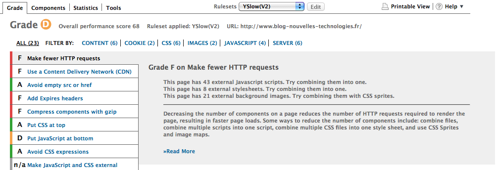 YSlow analyse les pages Web en se fondant sur des règles de Yahoo et la raison pour laquelle celles-ci peuvent être lentes. Si vous voulez regarder de plus près la performance de vos pages Web, YSlow est le choix définitif. Il décortique chaque élément d’une page Web, du plus simple (balises HTML, feuilles de style CSS, images) et affiche la performance combinée avec le taux de la page Web selon un ensemble de règles définies.