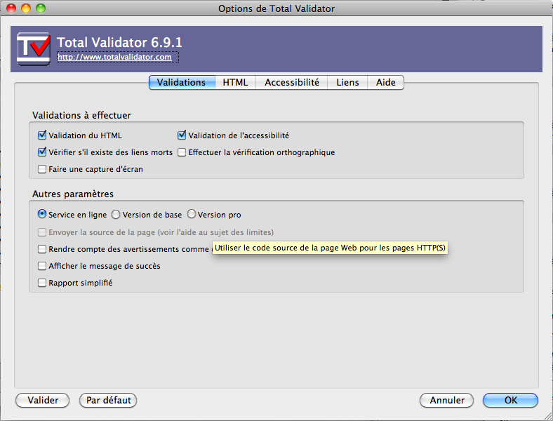 Total Validator est un outil de validation qui va valider le code HTML (XHTML, HTML 4, etc.), vérifier les liens morts, prendre des captures d’écran via différents navigateurs et systèmes d’exploitation pour savoir comment vos pages Web sont interprétées sur les différents navigateurs et OS. Il va également faire une vérification orthographique (en cinq langues différentes). Il permet également la validation d’accessibilité des pages (WCAG, US-508).