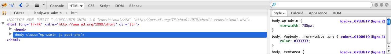 Un simple clic sur l’icône à droite de la barre de statut en bas de l’écran permet l’ouverture de Firebug dans un panneau au bas de l’écran. Firebug fournit également un inspecteur des éléments. Pour cela, il vous suffit de cliquer sur l’onglet « HTML » dans la barre principale. Vous trouverez à gauche, le cadre présentant le code source de la page sous forme d’arbre déroulant et à droite, un second cadre comportant 3 onglets : « Style », « Apparence » et « DOM ».