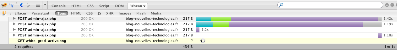Une autre grande caractéristique de Firebug est l’onglet “Réseau”. Si votre page se charge lentement, il vous suffit d’activer la balise “Réseau” et de jeter un œil aux différents graphiques disponibles. Dans cette partie, chaque élément est décomposé pour analyser : le poids, le temps d’exécution. De plus, en bas vous pouvez voir le nombre de requêtes qui se sont faites vers le serveur pour votre page ainsi que le nombre total de Ko téléchargés et le temps qu’il a fallu pour charger l’ensemble. Alors prêt à améliorer vos performances ?