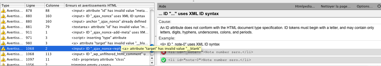 Lorsque l’on clique dessus, la source HTML de la page est affichée et on voit le détail de la validation avec les différentes erreurs, avertissements. Les deux algorithmes, Tidy et OpenSP sont intégrés à l’intérieur de Mozilla Firefox et permettent la validation en local sur votre machine, sans envoyer de HTML à un serveur tiers. Ainsi, avec l’add-on installé, vous pouvez accéder localement à la validation de vos pages. Vous ne pourrez pu remettre en cause la validité de votre site !