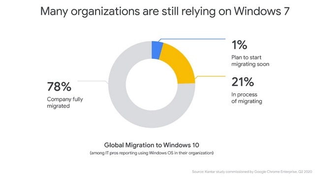 Google souligne que la migration vers Windows 10 faisait partie de la feuille de route de nombreuses organisations cette année. Selon une étude Kantar commandée par Google Chrome Enterprise au cours du second trimestre de cette année, près de 21 % des entreprises sont en train de migrer vers Windows 10, tandis qu’au moins 1 % n’ont même pas entamé le processus de migration.