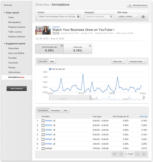 La version bêta du rapport d’annotations vous permet de visualiser les données sur la performance des annotations que vous avez pu insérer dans votre vidéo, avec un éclairage supplémentaire sur le nombre de clics des spectateurs. Malheureusement n’ayant jamais inséré d’annotation dans mes vidéos je reçois un beau message me précisant que “le contenu sélectionné ne comporte pas de données relatives à des annotations”. Voici une capture récupérée dans l’article de Youtube :
