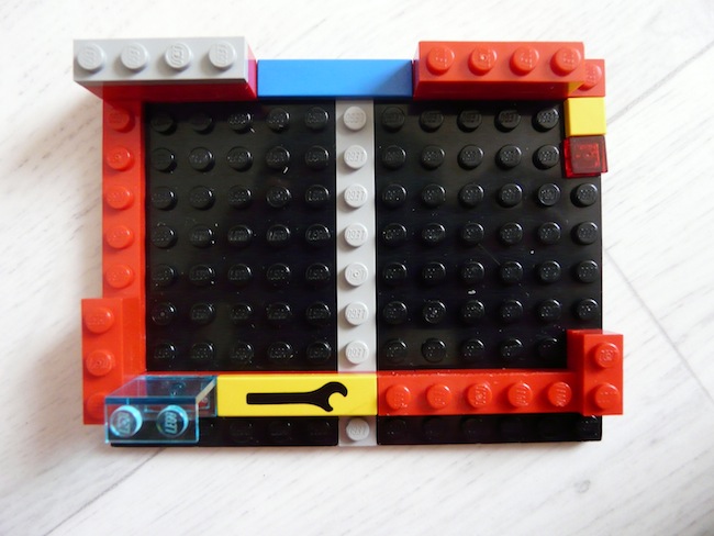 - Pas grand chose à dire pour cette prochaine étape, si ce n’est qu’il faut trouver une plaque (ou plusieurs plaques, mais le moins possible car c’est ce qui maintiendra le tout) pour faire le dessous. Pour sa part, Fabien a pris deux plaques plus une barre plate pour mettre au milieu. Pour le dessous de cette plaque, assemblage avec des petites plaques de même couleur pour l’esthétique