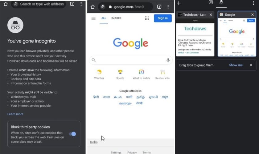 Ouvrez maintenant un onglet en mode Incognito et utilisez le raccourci de capture d’écran de votre smartphone (cela se fait généralement en appuyant simultanément sur les boutons de volume et d’alimentation). Le navigateur permettra de capturer la capture d’écran comme d’habitude et de l’enregistrer sur votre smartphone. Au cas où vous vous poseriez la question, la capture d’écran conservera le symbole du mode Incognito. De cette façon, les autres sauront que vous avez pris la capture d’écran en mode Incognito. Il s’agit d’un élément trivial, mais que vous devez garder à l’esprit au cas où vous souhaiteriez partager la capture d’écran avec d’autres personnes.