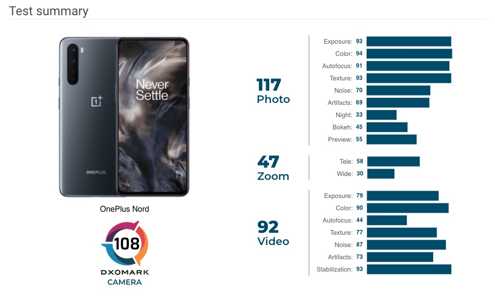 Avec un score moyen de 108 points, le OnePlus Nord est moyen aux yeux de DxOMark – le Huawei Mate 40 Pro, qui occupe la première place, a obtenu 136 points. Ce score n’est pas du tout comparable à celui des modèles phares, mais légèrement supérieur à celui de certains modèles, dont l’iPhone SE (2020). Le score de la caméra de OnePlus Nord de DxOMark est également inférieur de 3 points au score de 111 obtenu par le Pixel 4a qui est fourni avec un seul capteur photo à l’arrière qui fait son travail assez efficacement.