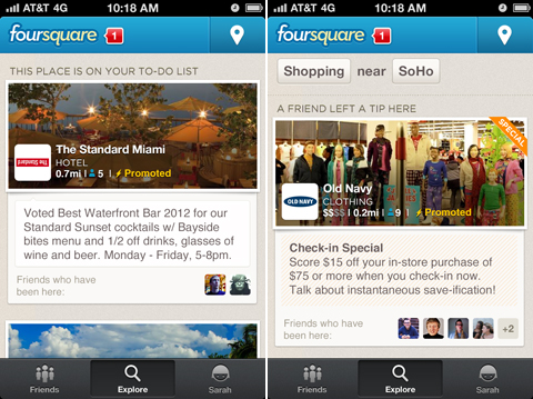 Ces dernières paient sous le modèle du “coût par action”, soit au nombre de clic sur leurs publicités, et non pas au nombre de vues. Ainsi, les annonces surgissent lorsque les utilisateurs sont dans l’onglet “Explorer”. Mais comment s’affichent-elles ? Les “Promoted Updates” indiquent aux utilisateurs ciblés les nouveautés d’un commerce se trouvant à proximité de leur localisation, et les “Promoted Specials” présentent de leur côté les différentes offres proches (réductions sur présentation de vos check-ins par exemple).