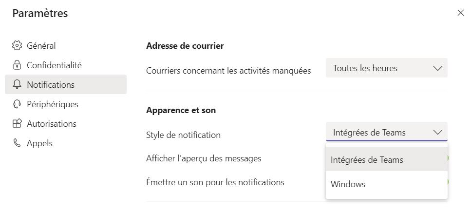 Une fois publiées, les nouvelles options de notifications apparaîtront dans Microsoft Teams sous « Paramètres > Notifications > Apparence et son > Style de notification ». Deux options différentes vous seront proposées, à savoir Windows et Intégrées de Teams.