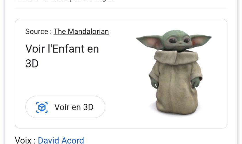 La recherche Google sur les smartphones propose une variété d’amusants modèles 3D, allant des dinosaures aux chats. Le dernier en date est Grogu, plus communément appelé Baby Yoda, de la populaire série TV The Mandalorian de Disney. En effectuant une recherche sur l’un des trois termes susmentionnés, vous obtiendrez un panneau d’information sur le personnage.