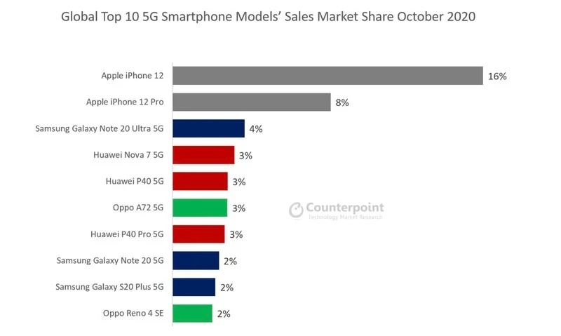 Alors que Apple ne partage plus aucune donnée sur les ventes de son smartphone, les statistiques publiées par Counterpoint Research montrent que l’iPhone 12 est déjà le smartphone 5G numéro un dans le monde. Selon leurs données, l’iPhone 12 représentait 16 % des ventes de smartphones en octobre 2020, suivi par l’iPhone 12 Pro avec 8 %.