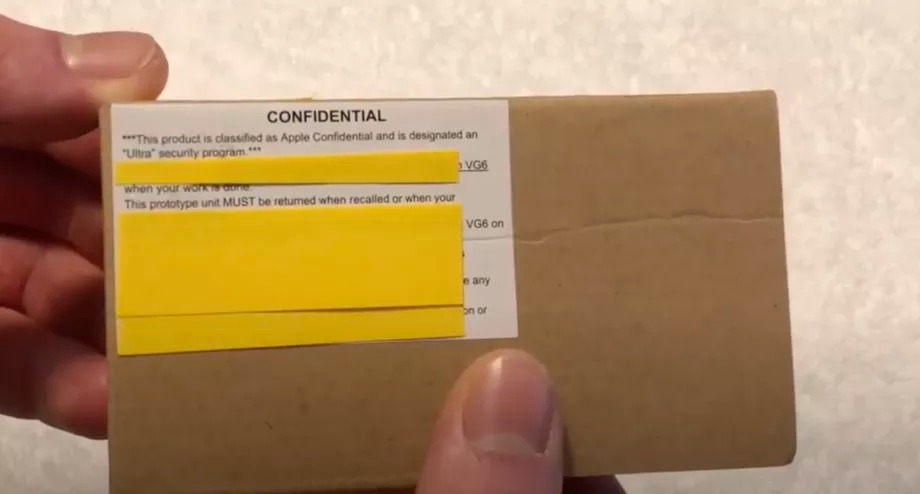 La vidéo commence par montrer ce qui semble être l’emballage en carton original utilisé pour livrer le matériel prototype aux testeurs. « This product is classified as Apple Confidential and is designated an ‘Ultra’ security program », lit-on sur l’étiquette. « Ce prototype DOIT être retourné lors du rappel », voit-on sur l’étiquette avant d’être masqué pour cacher les origines de l’appareil. Un autocollant au dos du prototype montre qu’il s’agit d’une configuration « PVTe », ce qui signifie probablement qu’il s’agit d’un test de validation de production (ingénierie) conforme au langage utilisé sur les précédents matériels de développement d’Apple, comme la carte EVT qui a fui pour le premier iPhone.