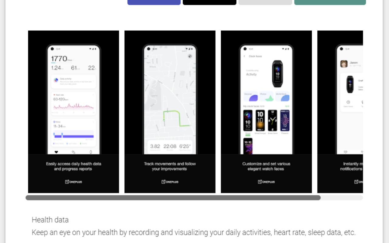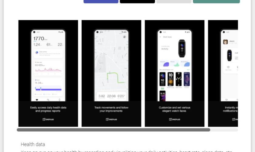 L’application complémentaire OnePlus Health a été mise en ligne sur le Google Play Store hier soir, avant le lancement du bracelet. L’application est décrite comme suit : « Appairez et gérez divers appareils connectés tels que des smartwatches et des bracelets ». Cependant, ce qui a attiré notre attention, c’est un rendu officiel du OnePlus Band parmi les captures d’écran de l’application.