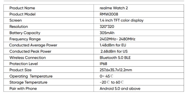 La liste de la FCC comprend également le manuel d’utilisation de la realme Watch 2. Il nous permet non seulement d’examiner de près la conception (rendu officiel, photo ci-dessus), mais aussi la fiche technique complète. La realme Watch 2 possède le même écran TFT de 1,4 pouce avec une résolution de 320 x 320 pixels que la montre originale. Elle est cependant plus grande et abrite une énorme batterie d’une capacité de 305 mAh, soit presque le double de la taille de la batterie d’origine.