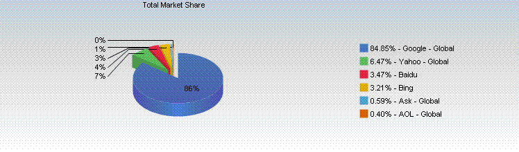 Selon les dernières statistiques de NetMarketShare, Google possède environ 85% de la part de marché mondiale au quatrième trimestre 2010. Yahoo est le numéro 2 avec 6,47% de part, suivi de Bing, que je pensais être un féroce rival de Google du fait de son “installation” automatique avec un ordinateur Windows, avec seulement environ 3% des parts.