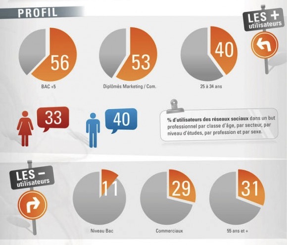 D’après l’infographie trouvée sur le blog du Modérateur, voici plusieurs diagrammes présentant le pourcentage d’utilisateurs des réseaux sociaux par catégorie professionnelle, par classe d’âge et par niveau d’étude.