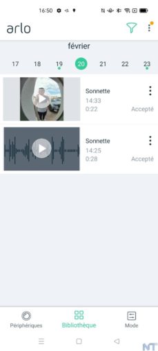 Toutes les séquences sont accessibles depuis l’application, qui affiche des vignettes précises pour chaque enregistrement ; vous pouvez les filtrer par type d’événement (personne, animal, véhicule, mouvement ou sonnette), par dispositif et par date. Trouver un événement particulier est très rapide, et vous pouvez télécharger n’importe quel clip sur votre smartphone.
