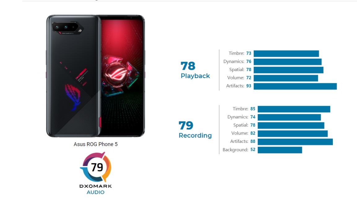 En octobre dernier, le protocole de test DxOMark Audio a été annoncé pour évaluer et classer les capacités de lecture et d’enregistrement audio des smartphones de manière objective et scientifique. Avant son lancement, le ASUS ROG Phone 5 a été testé, devenant ainsi le nouveau smartphone le plus performant en matière de performances audio, détrônant le Xiaomi Mi 10 Pro qui avait obtenu un score de 76 points.