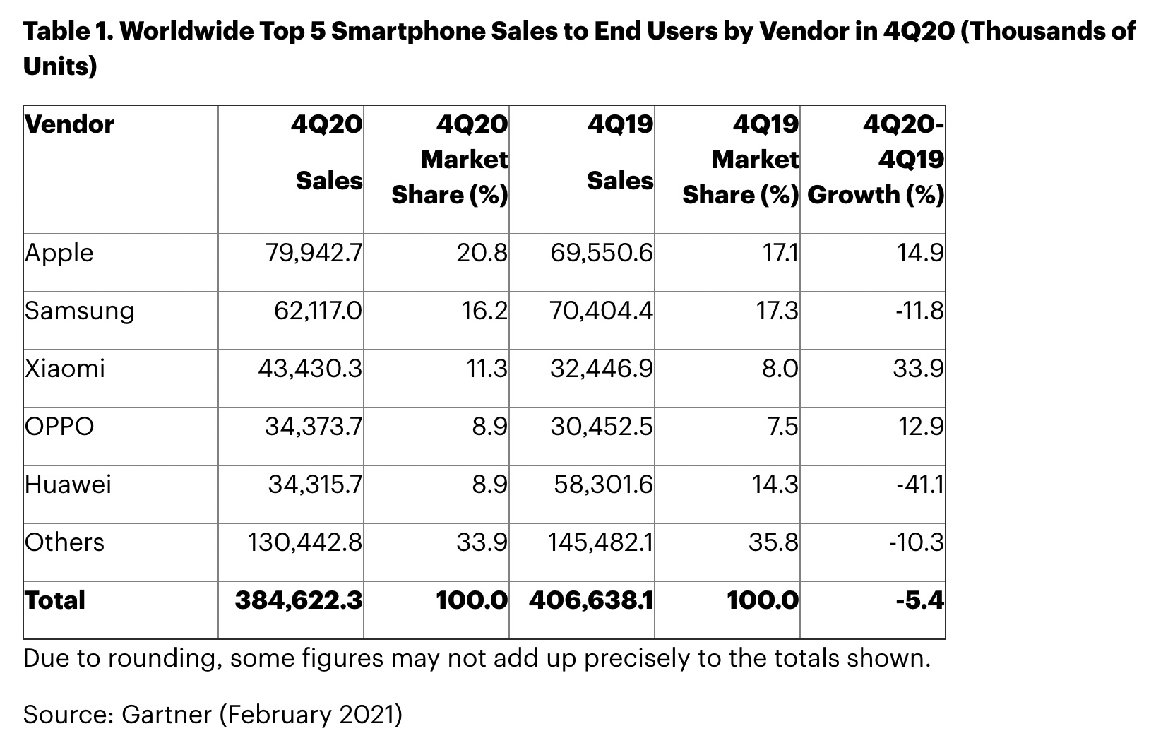 Xiaomi est troisième au classement avec 43,4 millions de smartphones vendus, et 11,3 % de parts de marché, ce qui représente cette fois une croissance de pas moins de 33,9 %. Les ventes de smartphones de Huawei se sont effondrées au cours du trimestre, passant de 58,3 millions d’unités à pas moins de 34,3 millions d’unités. Cela signifie que Huawei a obtenu une part de marché de seulement 8,9 % au quatrième trimestre 2020, une baisse importante par rapport aux 14,3 % de l’année précédente.
