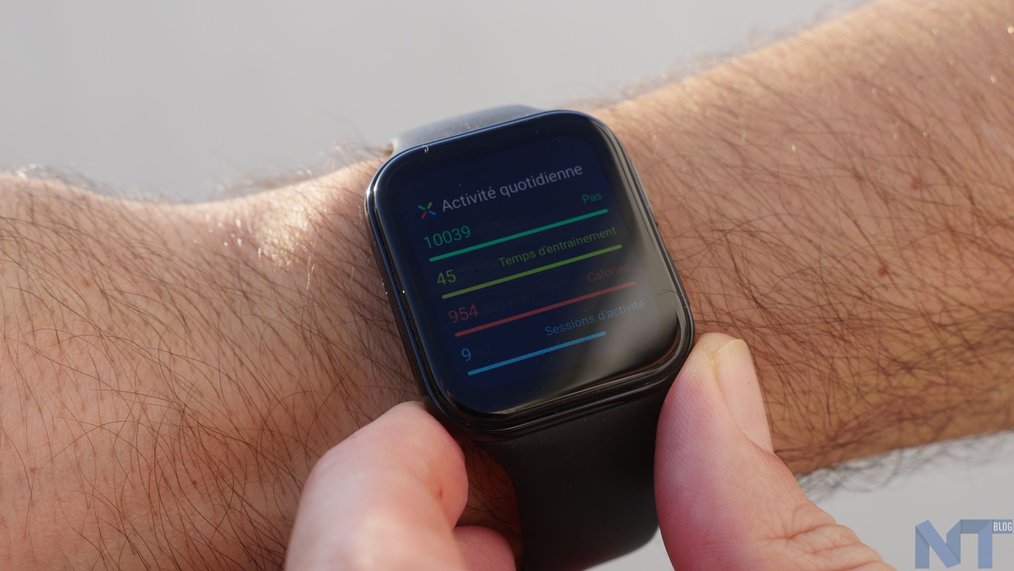 Au centre, on retrouve un écran AMOLED de 1,6 pouce, d’une résolution de 320 x 360 pixels, qui offre un environnement clair et net et une bonne visibilité en pleine lumière. C’est un écran d’excellente qualité et, même si vous ne profitez pas de l’espace et de la résolution supplémentaires, il reste un écran intéressant pour une smartwatch.