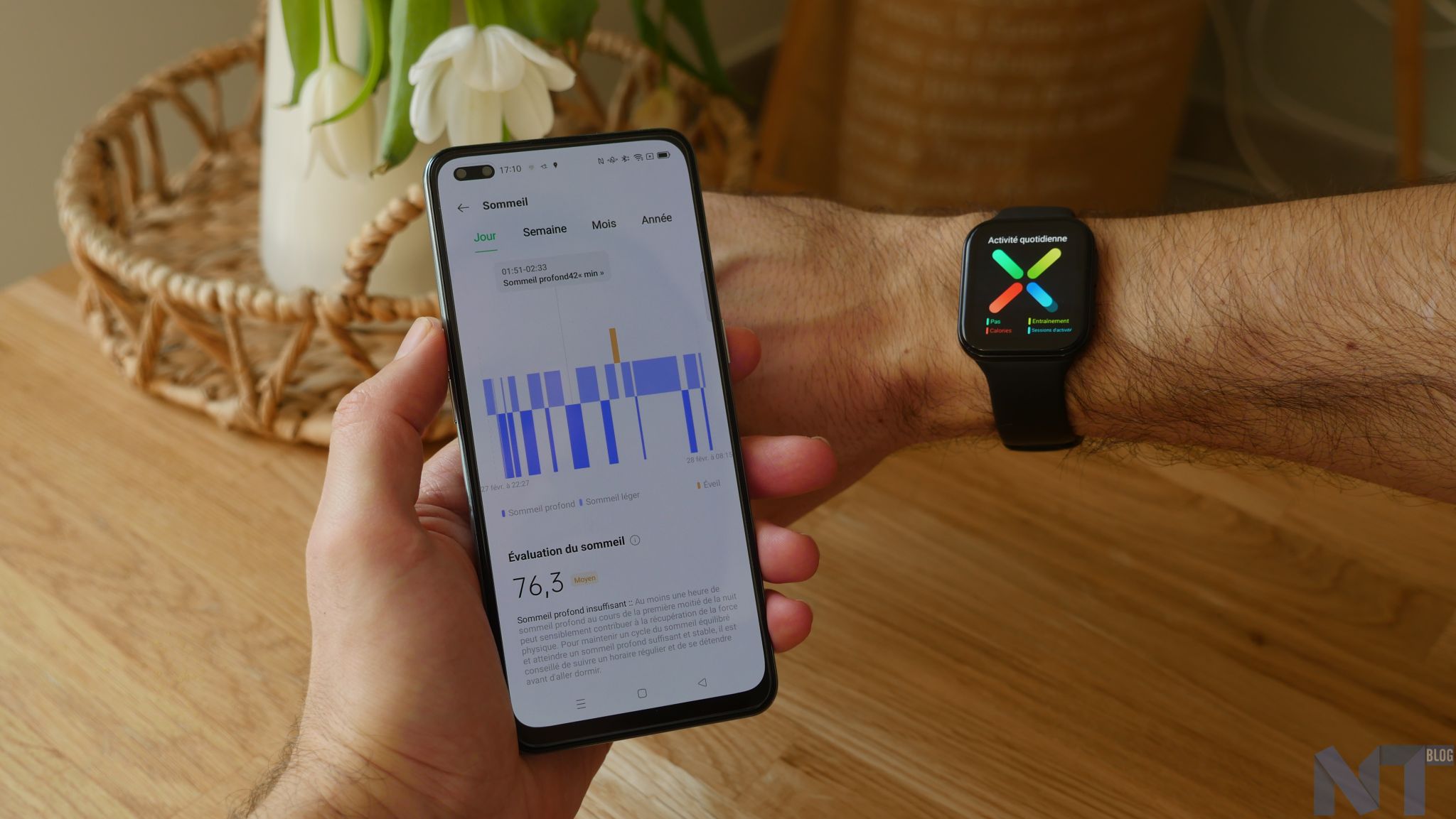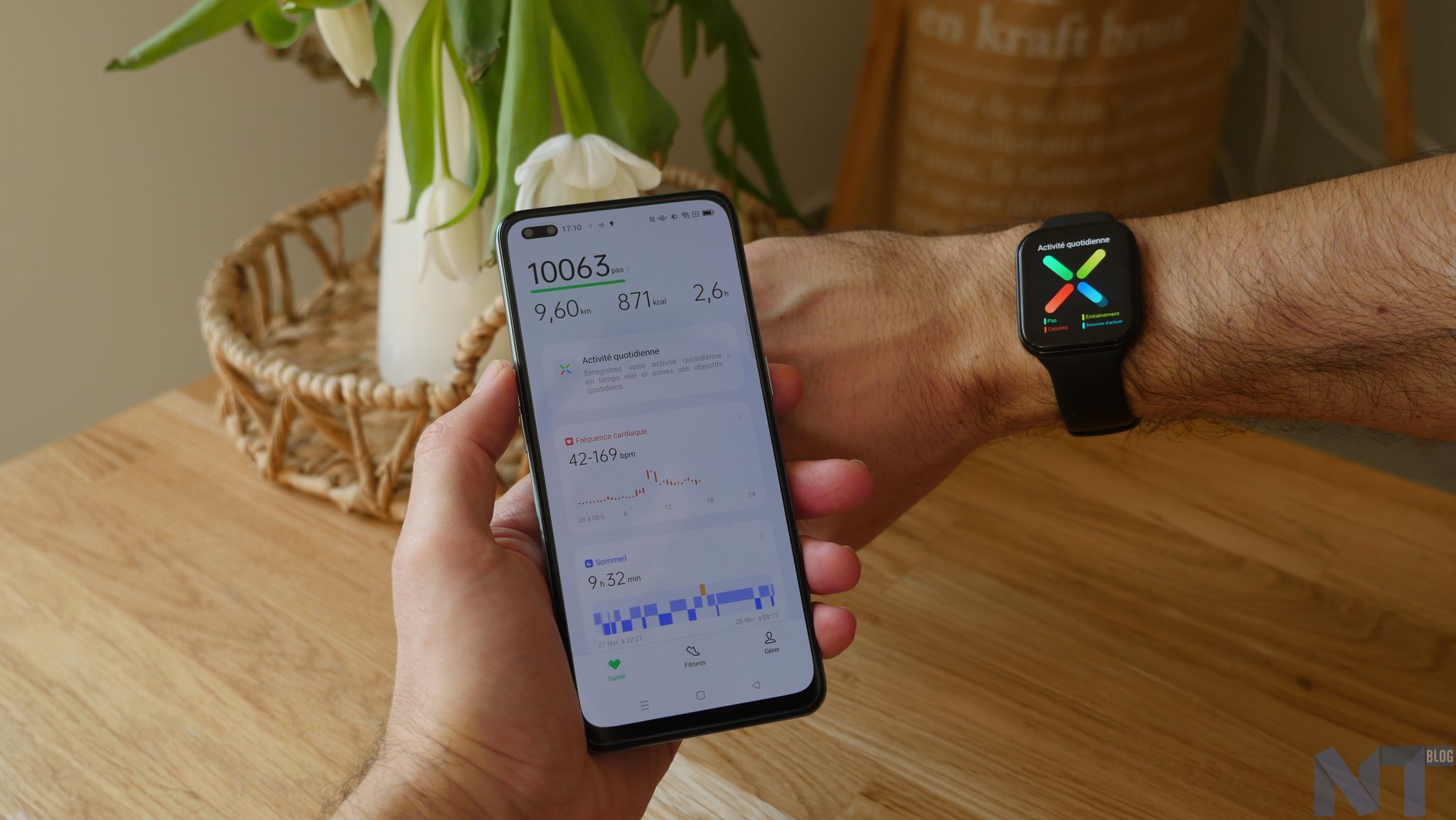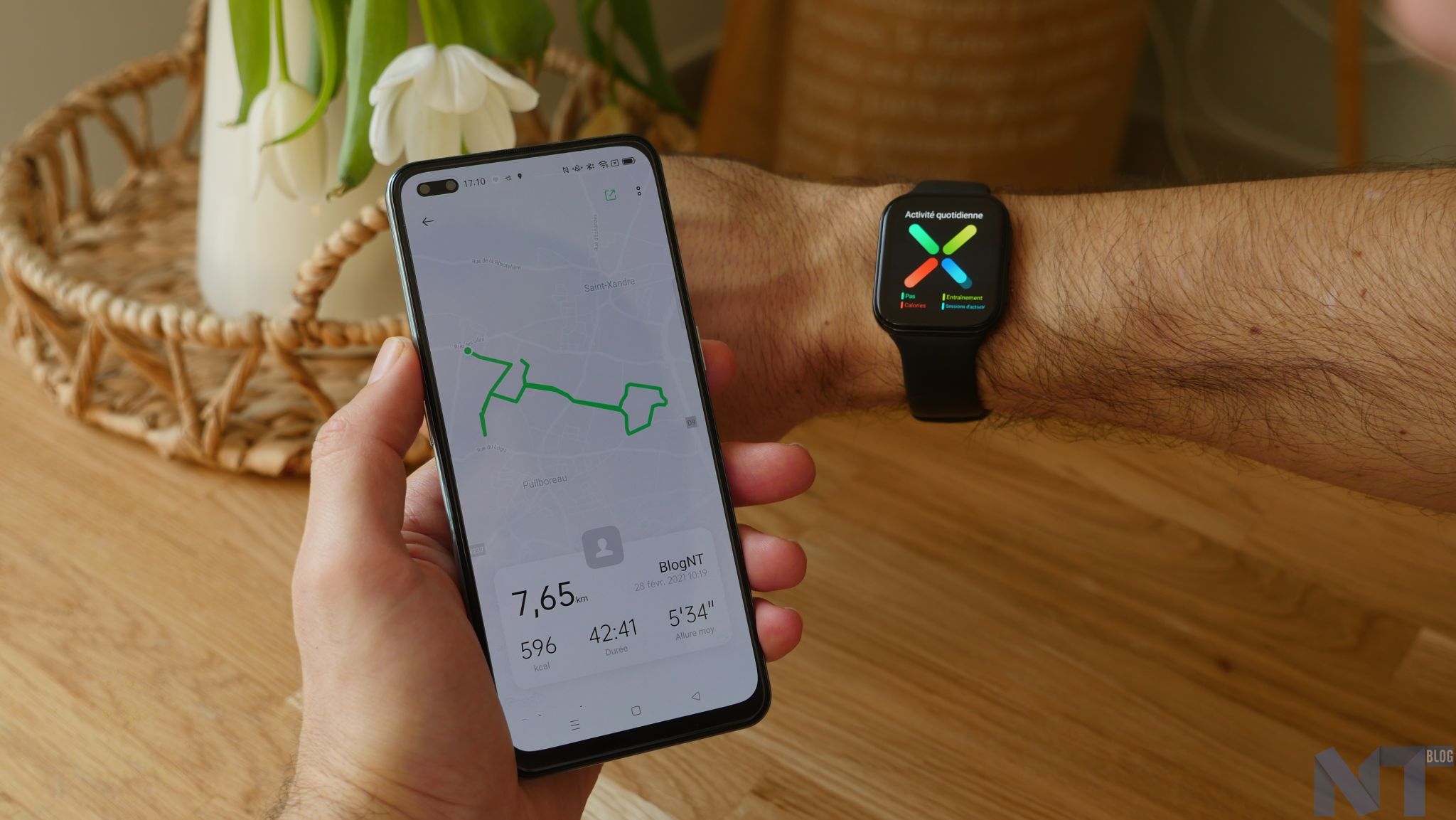 L’écran tactile est complété par deux boutons physiques qui se trouvent au ras du côté droit. Le bouton du bas peut être affecté à différentes applications, mais il lance par défaut l’application d’entraînement de OPPO. Enfin, concernant le bracelet, ce dernier peut être retiré en appuyant sur deux boutons à l’arrière du boîtier. Il est confortable de porter la montre pendant la journée, au lit et dès lors que vous faites de l’exercice. Cependant, j’ai eu quelques problèmes pour fixer le fermoir.