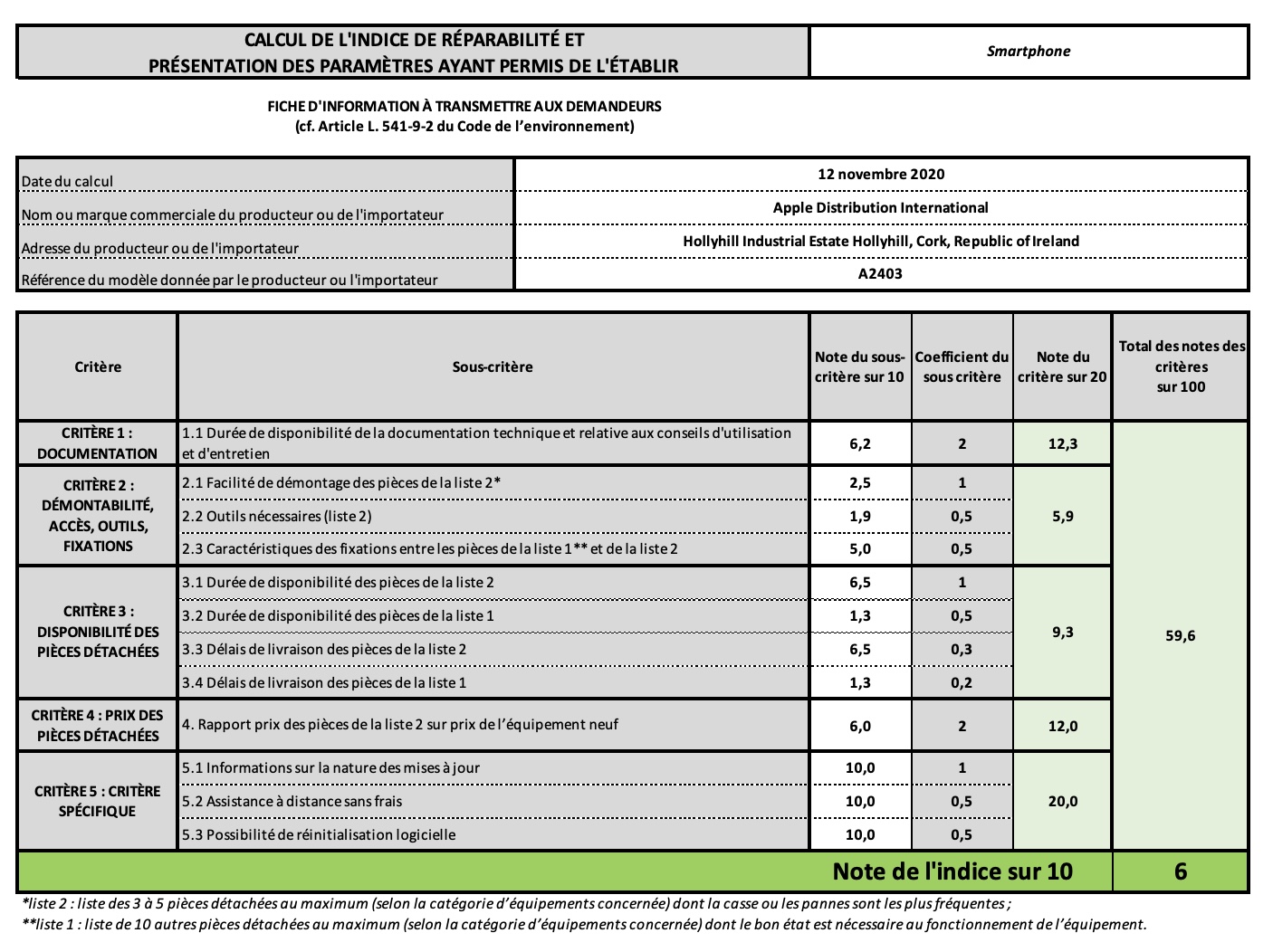 En raison de la loi nationale française, Apple ne sera pas le seul fabricant de produits électroniques à afficher des informations sur la réparabilité, car les fabricants de smartphones et de PC concurrents doivent également afficher des évaluations analogues. Le non-respect de cette loi entraînera des amendes, mais cela ne commencera pas avant 2022. Outre les ordinateurs portables et les smartphones, les téléviseurs, les machines à laver et les tondeuses à gazon font partie des autres catégories d’appareils électroniques qui doivent obtenir une note de réparabilité.