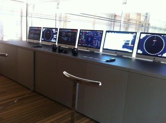 Nous avons très peu de détails sur ce yacht, mais The Verge indique que la coque externe est en aluminium léger et mesure près de 80 mètres de long. Une autre image montre les six des sept iMac 27″ embarqués au sein du navire, et plus précisément dans le salle de commandement (espérons qu’ils n’ont pas Plans pour naviguer ;)).