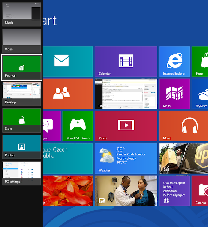Alt + Tab est un raccourci classique pour se déplacer rapidement entre les différentes fenêtres des applications lancées. Maintenant, il est rejoint par un nouveau raccourci clavier : Win + Tab. En réalisant cette combinaison de touches, vous allez faire apparaître une nouvelle interface sur le côté gauche de l’écran qui vous permet de vous déplacer uniquement dans les applications Windows 8. Autrement dit, il s’agit d’une réelle interface multi-tâches lorsque vous n’êtes pas dans l’environnement de bureau classique.