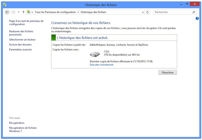À la manière de Time Machine d’Apple, l’historique de fichiers de va être capable de mémoriser plusieurs versions d’un même fichier, et vous aider à choisir quelle version récupérer. Un détail d’important, si jamais vous changez le nom du fichier que vous souhaitez restaurer, l’historique est perdu….