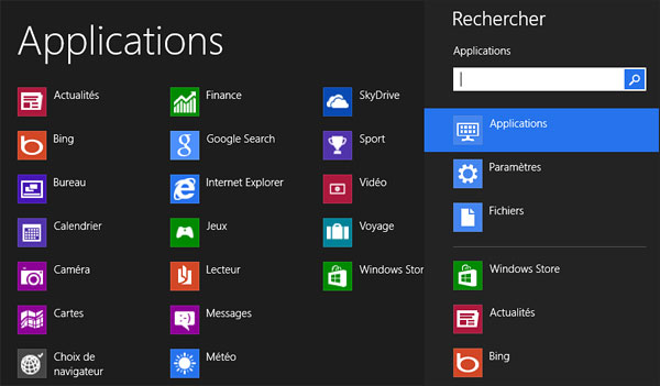 Windows 7 comprend une fonction de recherche qui était à portée de main, mais Windows 8 arrive en fournissant des fonctionnalités de recherche encore meilleures par le biais de sa nouvelle interface. Désormais, il est possible de filtrer votre recherche par applications, paramètres ou fichiers. Vous pouvez accéder à la fonction de recherche depuis n’importe quel écran en plaçant le curseur dans le coin supérieur droit de votre écran. Cela activera la barre des “charms”, qui affichera une loupe pour la recherche. Sélectionnez une catégorie et tapez ce que vous recherchez.