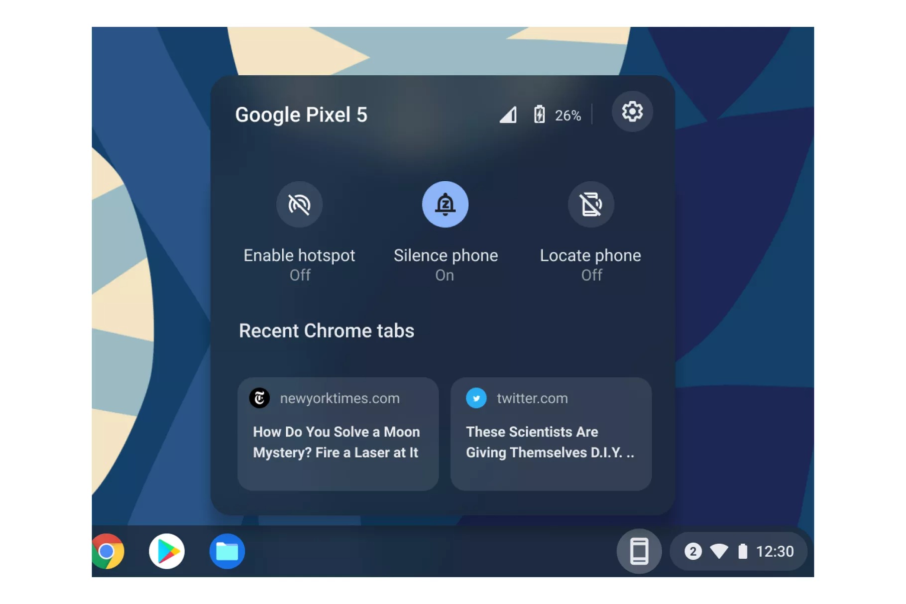 Le plus grand ajout est une nouvelle fonction Phone Hub qui permet de connecter un smartphone Android à un Chromebook. Elle permet aux utilisateurs de Chrome OS de répondre à des SMS, de vérifier l’autonomie de la batterie d’un smartphone, d’activer son hotspot Wi-Fi et de localiser facilement un appareil.