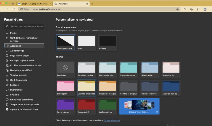 Vous pouvez maintenant ouvrir les paramètres de Edge, aller dans la section Apparence, et vous trouverez de nouvelles options de thème.