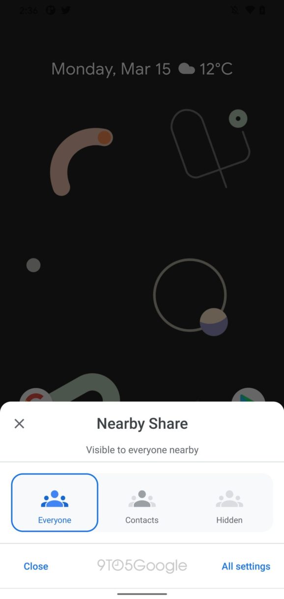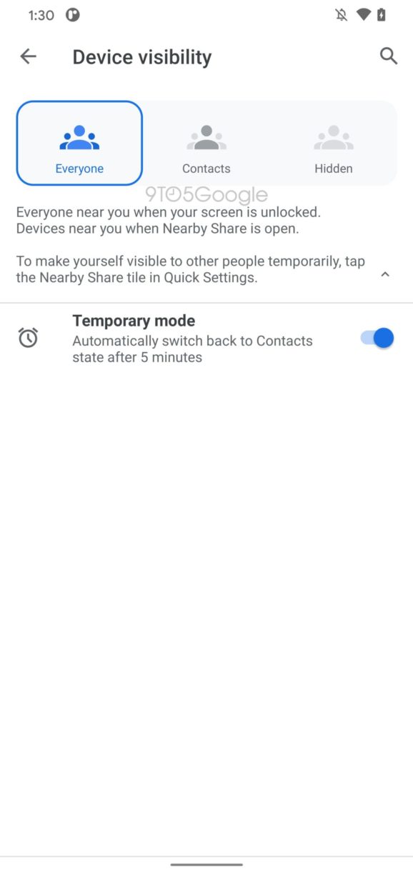 En plus de cela, Google va également remanier le menu contextuel pour « Partage à proximité ». Il ressemblera à l’interface utilisateur de AirDrop qui permet aux utilisateurs de sélectionner les options de visibilité pour la fonctionnalité. Ainsi, en utilisant ce menu, les utilisateurs pourront basculer entre « Tout le monde » et « Contacts ». En outre, il existe également un « mode temporaire » qui permet de rétablir la visibilité de « Tout le monde » à « Contacts » automatiquement après 5 minutes d’inactivité.