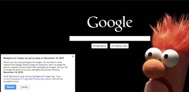 Merci d’utiliser les images de fond. Comme nous construisons une page de recherche Google plus simple pour tout le monde, nous ne supporterons plus la personnalisation avec des images de fond. Donc, vous ne serez plus en mesure de voir vos images de fond à partir 16 Novembre 2012.