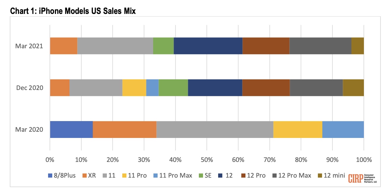 Le CIRP a constaté que les quatre nouveaux modèles d’iPhone 12 (12, 12 Pro, 12 Pro Max et 12 mini) ont représenté 61 % des ventes d’iPhone aux États-Unis au cours du trimestre. L’iPhone 11 avait la plus grande part pour un seul modèle, avec 24 % de toutes les ventes.