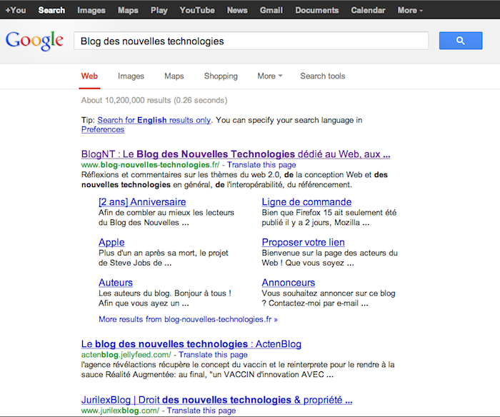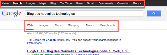 Cette nouvelle interface devrait vous choquer ! En effet, comme vous pouvez le remarquer, il y a une certaine duplication entre la barre de navigation Google (celle en noire) et cette ligne de liens dans les résultats dans les résultats de recherche. Allons-nous voir une mise à jour de la barre de navigation Google prochainement ?