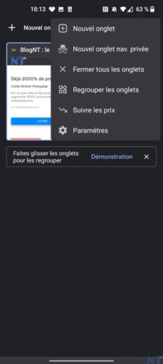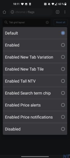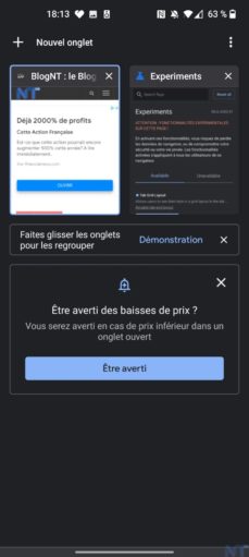 chrome://flags. Recherchez « Tab Grid Layout ». Vous pouvez également coller l’adresse suivante dans la barre d’adresse de Chrome sur votre téléphone Androidchrome://flags/#enable-tab-grid-layout - Dans la liste d’options, choisissez « Enabled Price notifications » et redémarrez votre navigateur.
