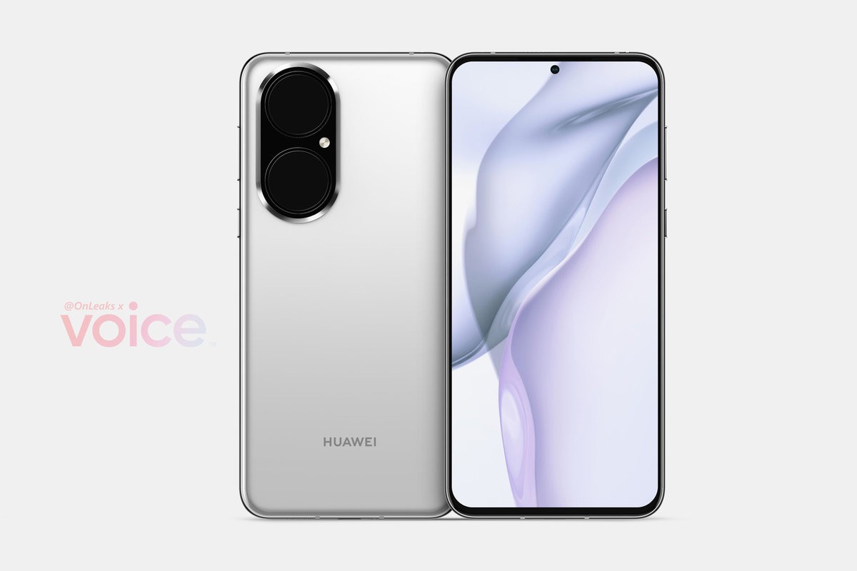 La face avant comprend un écran plat et poinçonné pour loger les caméras frontales et le Huawei P50 est présenté dans des teintes blanches et noires.