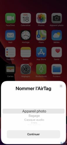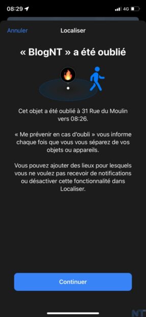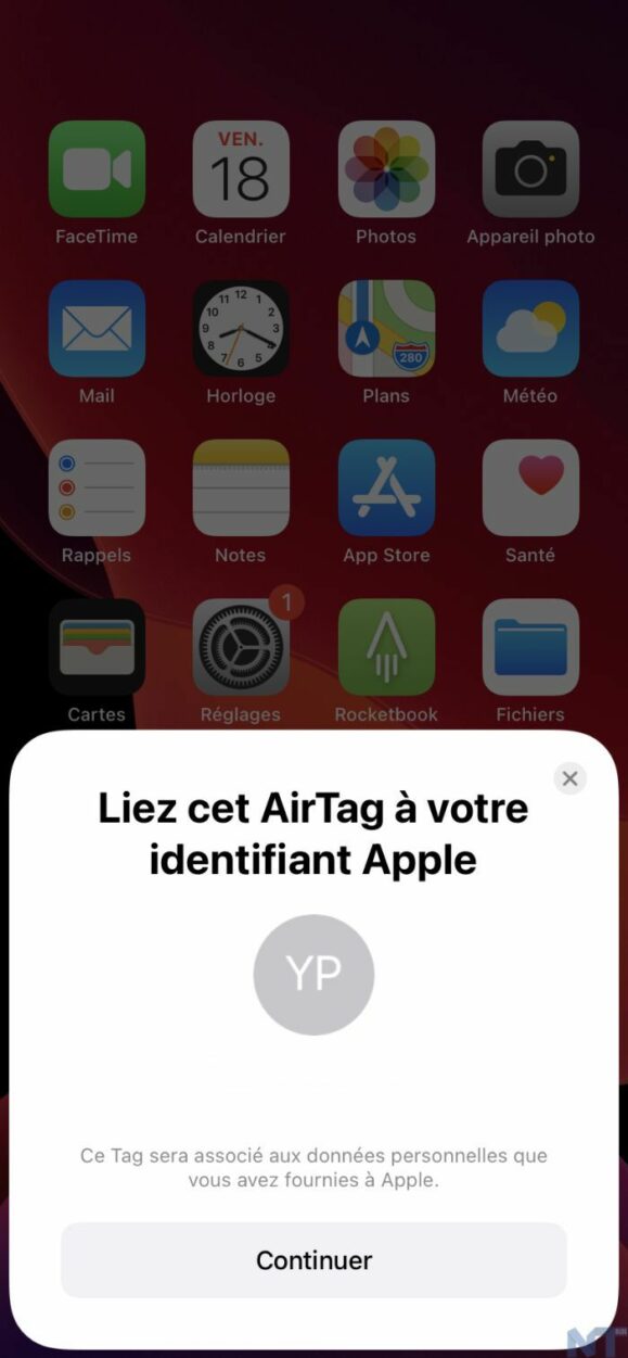 - Appuyez sur « Continuer » pour terminer l’enregistrement du AirTag à votre Apple ID