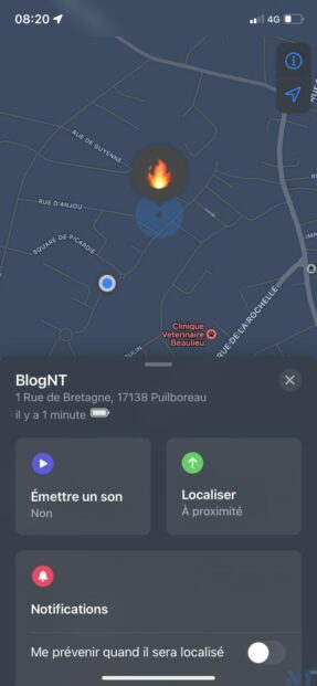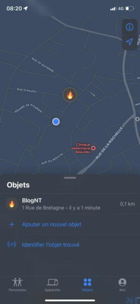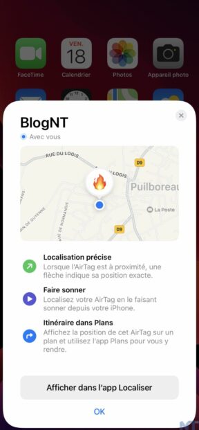 Le AirTag est maintenant appairé à votre iPhone ou iPad et ajouté au réseau Localiser. Le nouveau message explique brièvement plusieurs façons de retrouver l’accessoire s’il venait à disparaître. Dans l’application Localiser, vous verrez une carte en direct de l’emplacement du AirTag (s’il est à portée Bluetooth d’un iPhone, d’un iPad ou d’un Mac), un bouton pour diffuser le son du haut-parleur du tracker, et une option « Localiser » pour localiser précisément l’accessoire si votre iPhone est équipé d’une puce U1 (iPhone 11 et plus récents).