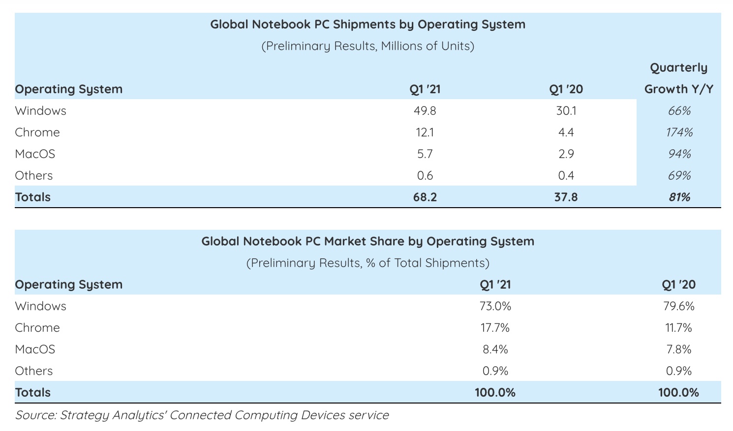 La demande de Chromebooks a également considérablement augmenté, puisque les ventes ont bondi de 4,4 millions d’unités à pas moins de 12,1 millions d’unités. Il s’agit d’une augmentation de 174 %, qui montre que Chrome OS est en train de devenir un digne rival de Windows, en particulier dans les entreprises. Et puis, les appareils macOS ont également fait un bond de 94 % pour passer de 2,9 millions d’unités à 5,7 millions d’unités.