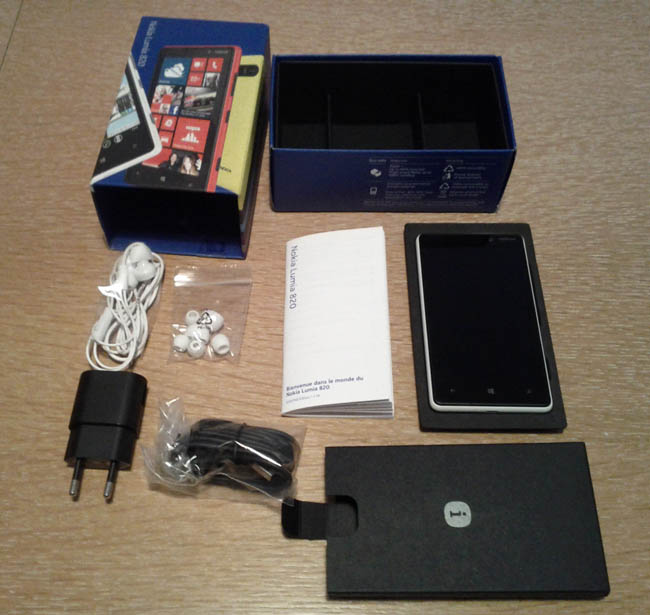 Concernant le contenu de la boîte, vous allez retrouver bien entendu votre smartphone Nokia Lumia 820, un chargeur Micro-USB, une batterie de 1650 mAh, un câble USB/Micro-USB pour transférer les données et charger votre mobile, un kit oreillette (avec des embouts supplémentaires pour s’adapter à vos oreilles), et enfin le manuel d’utilisation du produit.