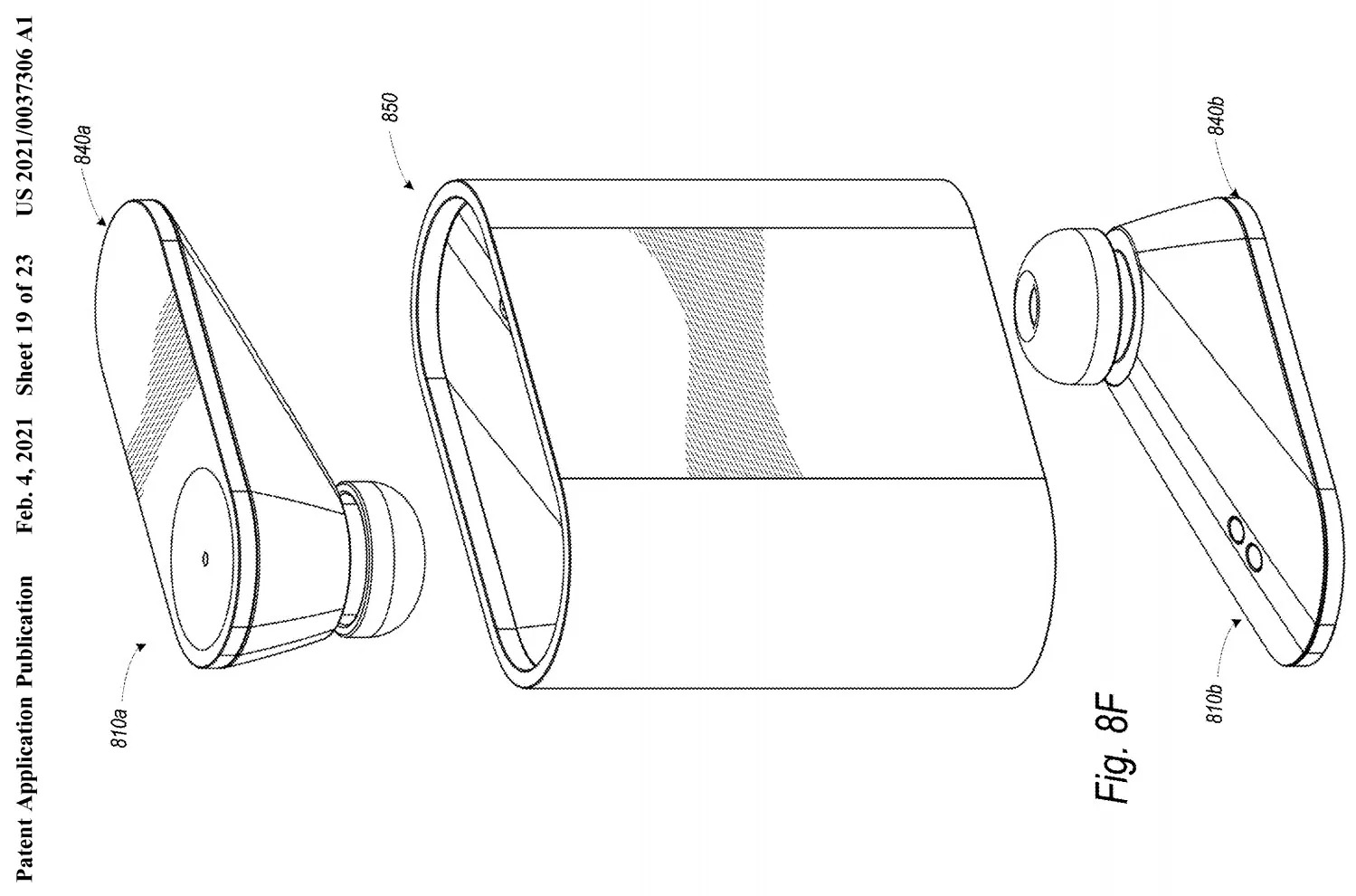 Certains de ces écouteurs présentent également des designs inhabituels. L’une des images du brevet montre une paire d’écouteurs sans fil avec des boîtiers longs et ovales, qui se glissent de chaque côté d’un boîtier de charge.