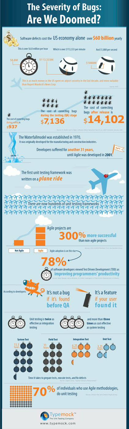 Faire des tests unitaires est presque une religion, mais quels sont les réels avantages ? L’infographie ci-dessous y répond aussi simplement que possible. Sachez que celle-ci a été créée par Typemock, la firme n’était donc pas complètement impartiale… En effet, la société propose des outils de test unitaire et des astuces pour écrire des tests en .NET et C/C++, permettant un développement agile.