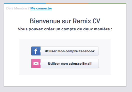 Donc, je commence par me rendre sur l’adresse https://remixcv.com/ et de là je clique sur le bouton “Créer mon CV gratuitement”. Ensuite, dans la fenêtre suivante on nous demande de quelle manière on souhaite créer notre compte RemixCV : par Facebook, ou par e-mail. C’est le second choix que j’ai choisi.