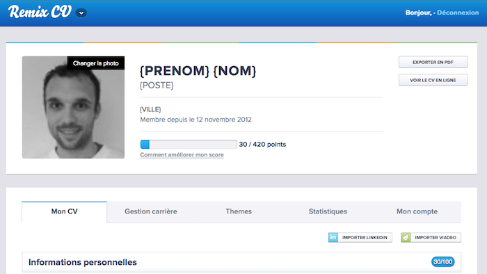 De là, on remplit trois informations : la catégorie dans laquelle notre CV va être classé, notre adresse e-mail et enfin le mot de passe de connexion. Après avoir cliqué sur le bouton “Valider”, je me retrouve sur la page de mon CV ! Trois informations renseignées, un clic et le tour est joué 😉 Bon me reste à entrer toutes mes informations … Mais, comme je l’ai mentionné ci-dessus, je vais prendre l’option “Import depuis LinkedIn” – sachez que vous pouvez le faire avec votre compte Viadeo également.