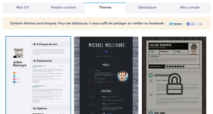 Comme vous pouvez le voir en cliquant sur ce lien, l’idée est de “donner du style à vos candidatures”précise l’équipe. Pour ce faire, vous allez accéder à une sélection de thèmes, avoir la possibilité d’importer vos données provenant de LinkedIn et Viadeo et ainsi gagner un temps précieux, d’obtenir des statistiques avancées de votre profil et enfin de postuler aux offres d’emploi Remixjobs en 1 clic ! Autrement dit, RemixCV arrive un bagage complet de fonctionnalités qui vont ravir de nombreux chercheurs d’emplois, mais aussi les amoureux qui souhaitent avoir une forte image numérique…
