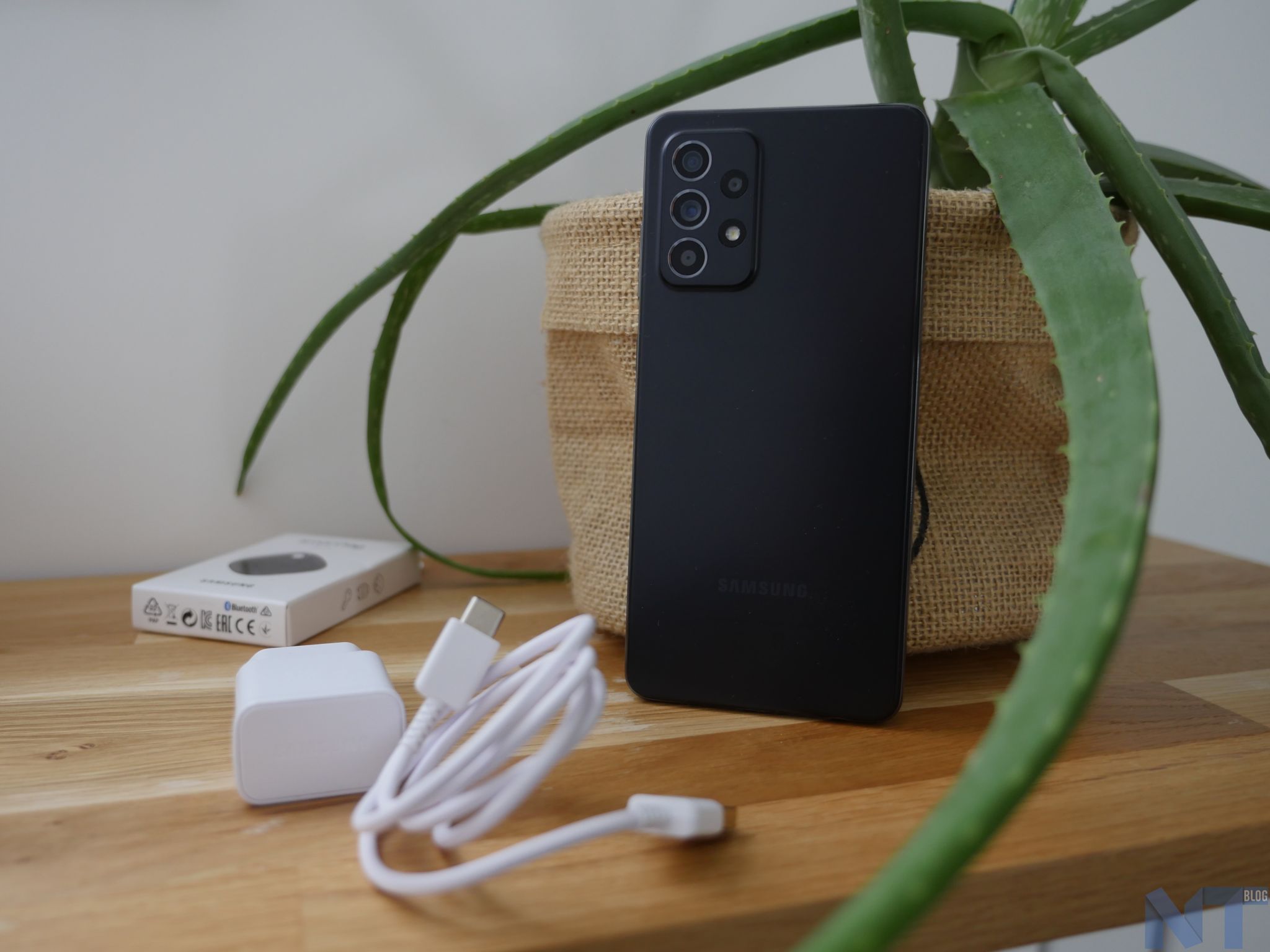 Le chargeur fourni dans la boîte a une puissance de 15 W, ce qui n’est pas idéal — ne comptez pas sur lui pour une charge rapide. Il permet de recharger le smartphone en 1 heure et 40 minutes — ce n’est pas si mal, mais ce n’est certainement pas le chargement le plus rapide qui existe. Le Galaxy A52 5G prend en charge un chargeur de 25 W, mais vous devrez l’acheter séparément si vous souhaitez en utiliser un.