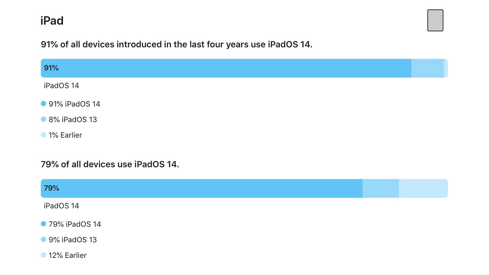 Pour ce qui est de iPadOS, le scénario est assez analogue. D’après les données d’Apple, 91 % des propriétaires d’iPad, dont le modèle sorti au cours des quatre dernières années, utilisent iPadOS 14.