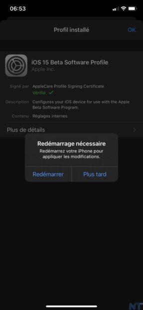 - Enfin, appuyez sur « Redémarrer » pour terminer le processus d’installation du profil du logiciel iOS 15 bêta